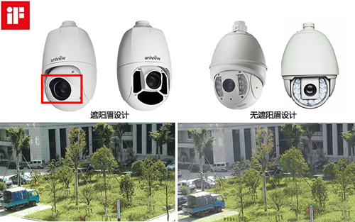 圖:帶“遮陽帽”的宇視球機(左)與業界普通球機圖像效果對比