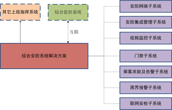 軌道交通綜合安防系統(tǒng)由安防網(wǎng)絡(luò)子系統(tǒng)、安防集成管理子系統(tǒng)、視頻監(jiān)控子系統(tǒng)、門禁子系統(tǒng)、車站乘客求助及告警子系統(tǒng)、周界報(bào)警子系統(tǒng)、聯(lián)網(wǎng)安檢子系統(tǒng)等構(gòu)成。